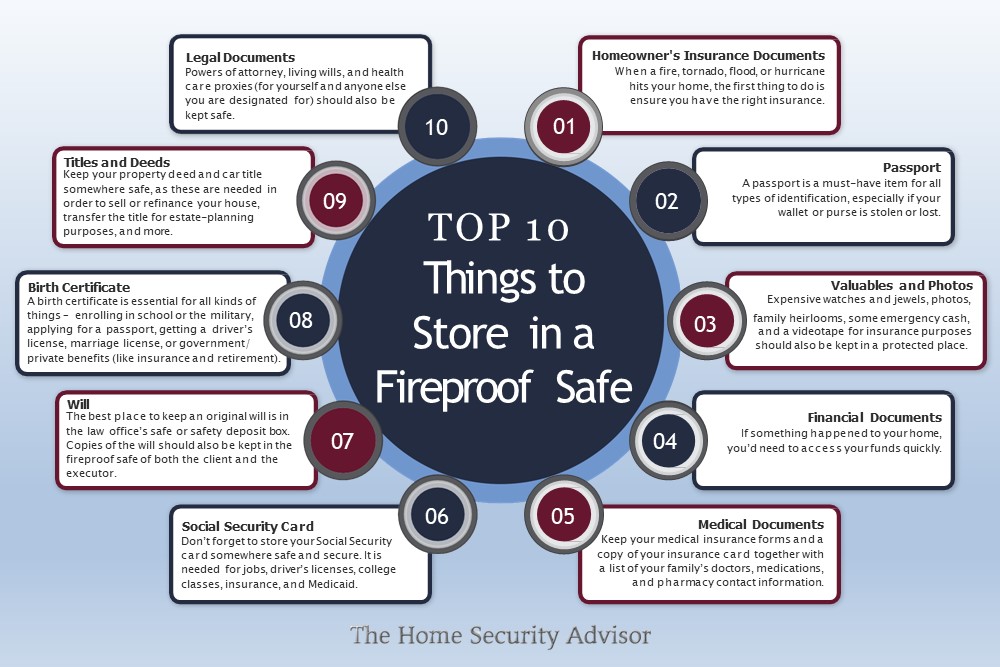 1. Homeowners' Insurance Documents – When a fire, tornado, flood, or hurricane hits your home, the first thing to do is ensure you have the right insurance. 2. Passport – A passport is a must-have item for all types of identification, especially if your wallet or purse is stolen or lost. 3. Valuables and Photos – Expensive watches and jewels, photos, family heirlooms, some emergency cash, and a videotape for insurance purposes should also be kept in a protected place. 4. Financial Documents – If something happened to your home, you’d need to access your funds quickly. 5. Medical Documents – Keep your medical insurance forms and a copy of your insurance card together with a list of your family’s doctors, medications, and pharmacy contact information. 6. Social Security Card – Don’t forget to store your Social Security card somewhere safe and secure. It is needed for jobs, driver’s licenses, college classes, insurance, and Medicaid. 7. Will – The best place to keep an original will is in the law office’s safe or safety deposit box. Copies of the will should also be kept in the fireproof safe of both the client and the executor. 8. Birth Certificate – A birth certificate is essential for all kinds of things – enrolling in school or the military, applying for a passport, getting a driver’s license, marriage license, or government/private benefits (like insurance and retirement). 9. Titles and Deeds – Keep your property deed and car title somewhere safe, as these are needed in order to sell or refinance your house, transfer the title for estate-planning purposes, and more. 10. Legal Documents – Powers of attorney, living wills, and health care proxies (for yourself and anyone else you are designated for) should also be kept safe. any more details please check out this image or visit this page: https://www.thehomesecurityadvisor.com/best-home-safes/